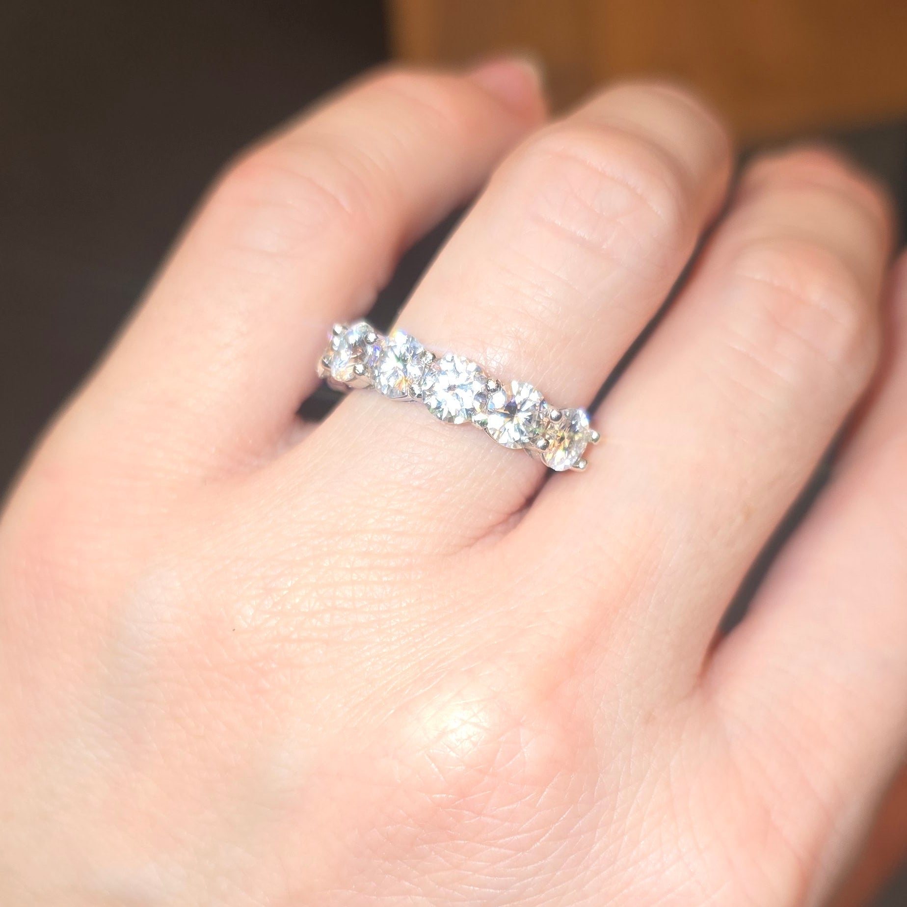Vacker ring med fem GRA-certifierade moissanite-stenar, vardera på 0,5 carat och VVS1-kvalitet. En perfekt kombination av briljans och stil, infattad i äkta 925 sterling silver med 18K guldplätering för en lyxig finish. Ett tidlöst smycke som passar både till vardag och fest