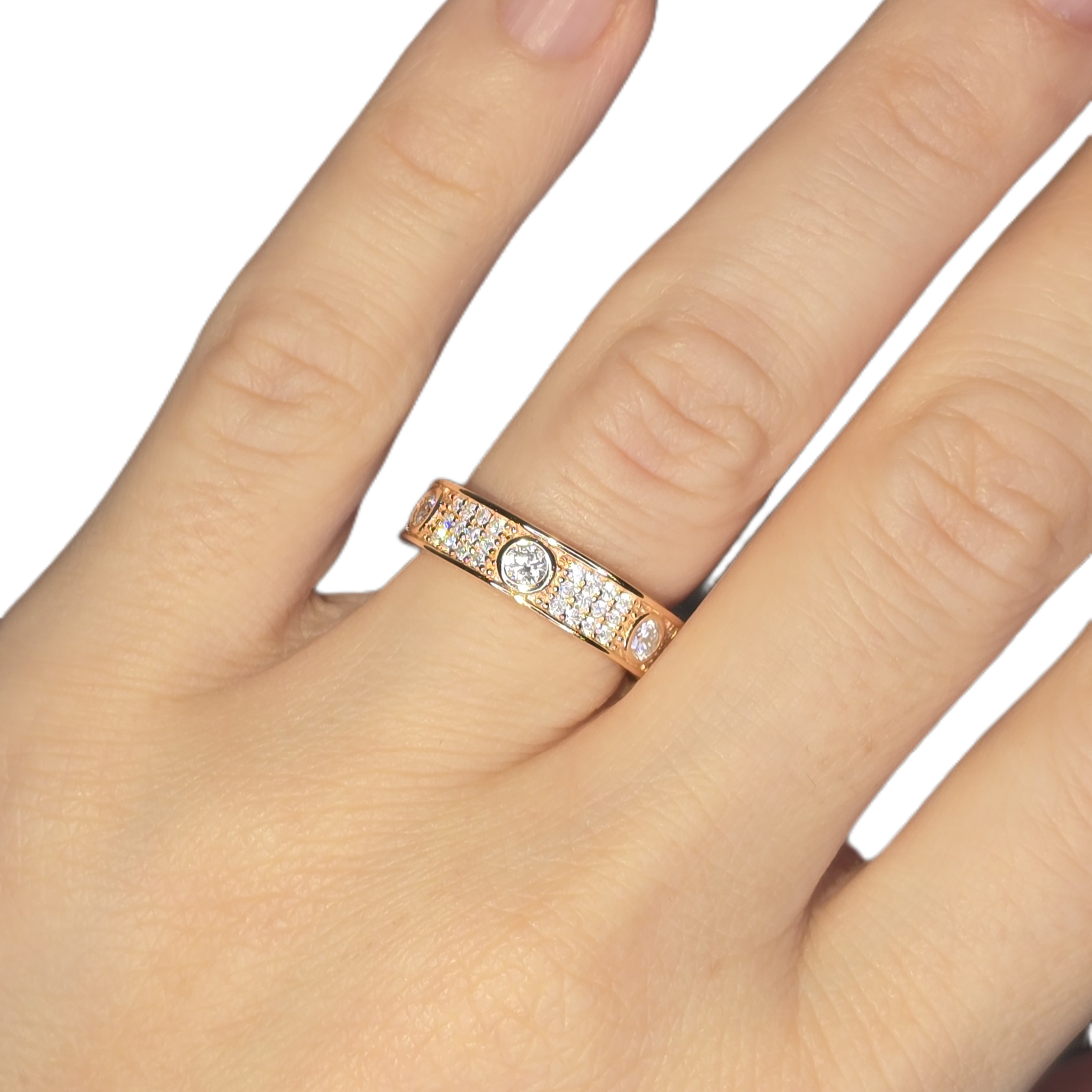 Lyxig ring med fem gnistrande GRA-certifierade moissanite-stenar, vardera 0,5 carat och VVS1-kvalitet, i en stilren design inspirerad av Cartier. Tillverkad i äkta 925 silver med exklusiv roséguldplätering för en varm, elegant finish. Perfekt för dig som vill bära klassisk elegans med en modern touch.