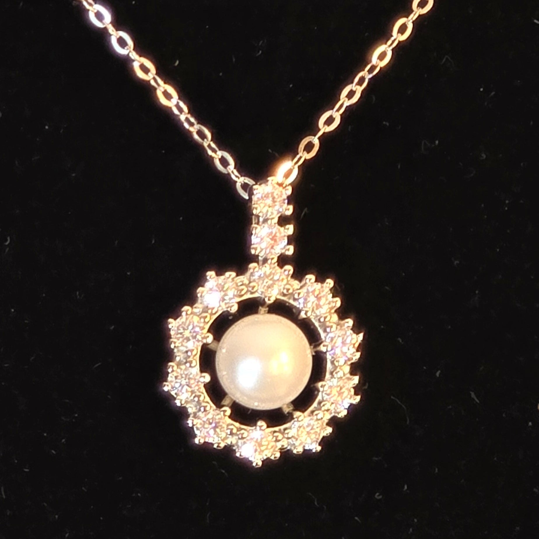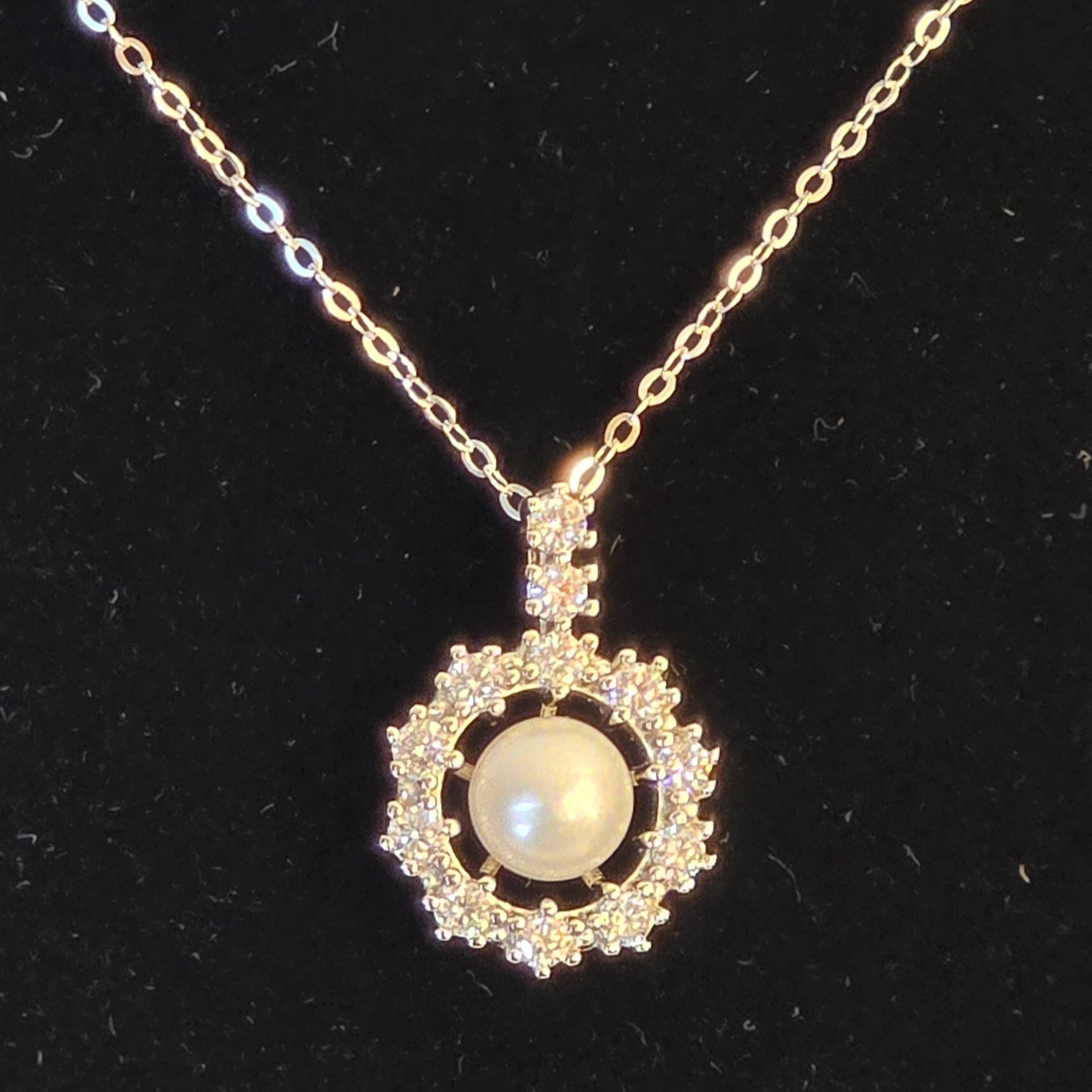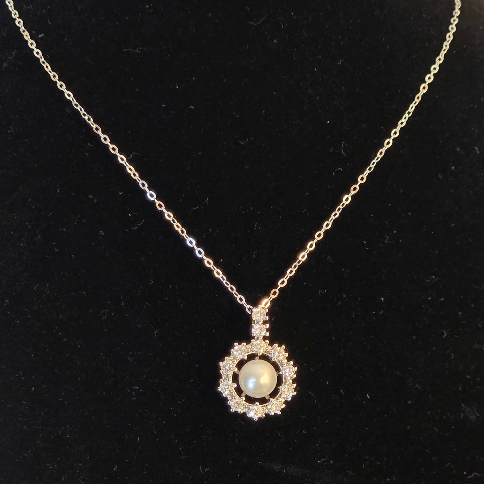 Denna eleganta halsband har ett klassiskt och sofistikerat utseende. I centrum sitter en vacker odlad pärla, omgiven av skimrande stenar som påminner om diamanter. Hänget hänger i en tunn kedja av äkta silver, vilket ger ett tidlöst och stilrent intryck.