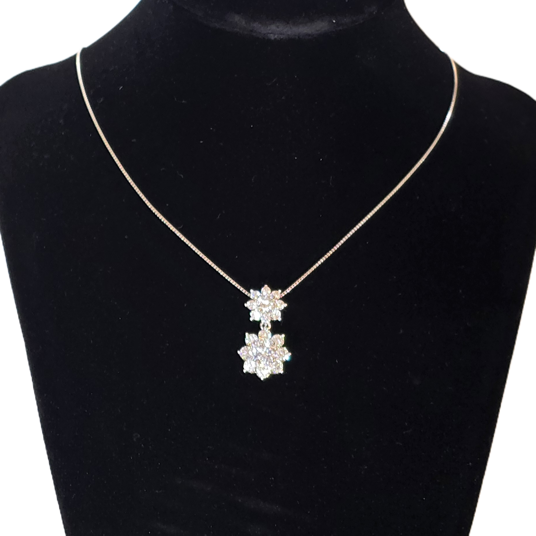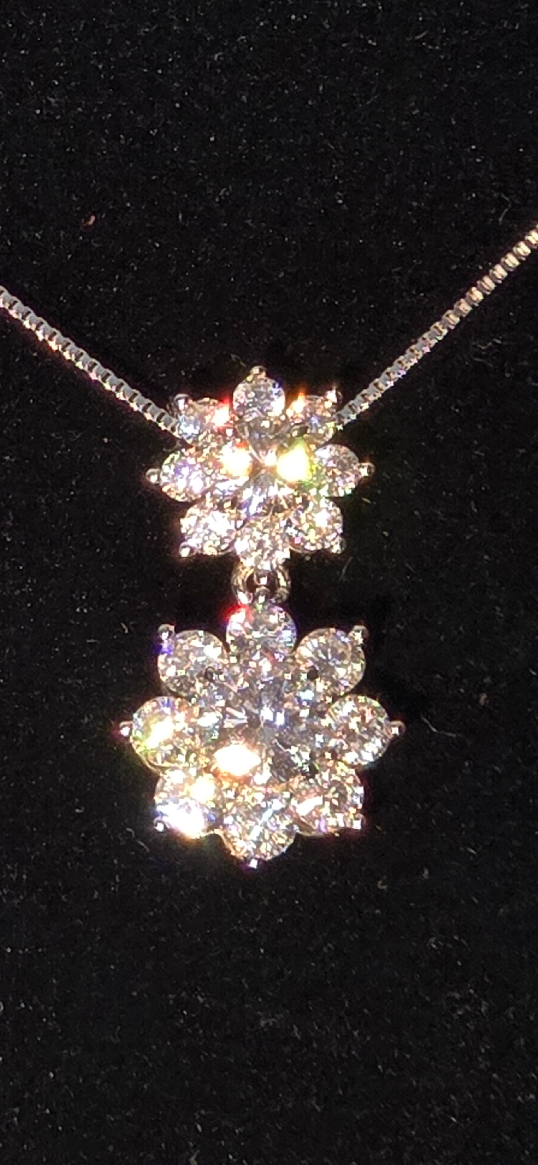 Ett exklusivt halsband med dubbla blomsterhängen, prydda med gnistrande moissanite-stenar i högsta kvalitet. Moissaniten är känd för sin briljans och likhet med diamant – här i D-färg, Excellent cut, VVS1 för maximal lyster.