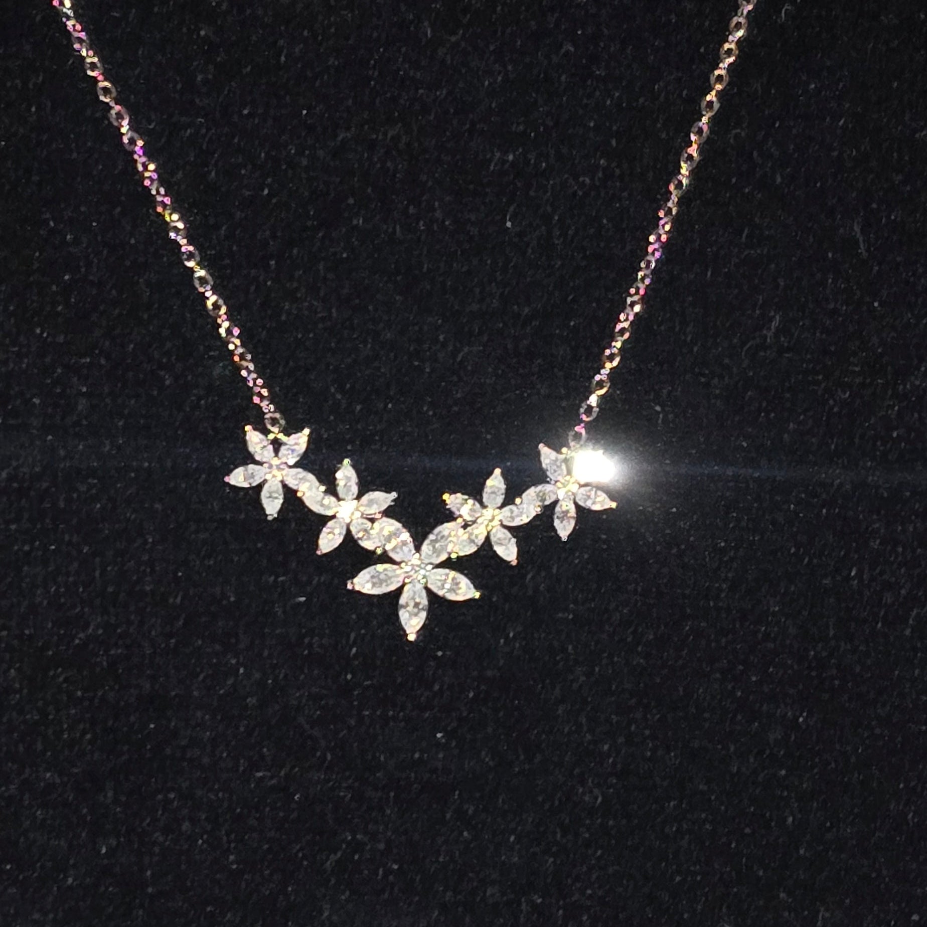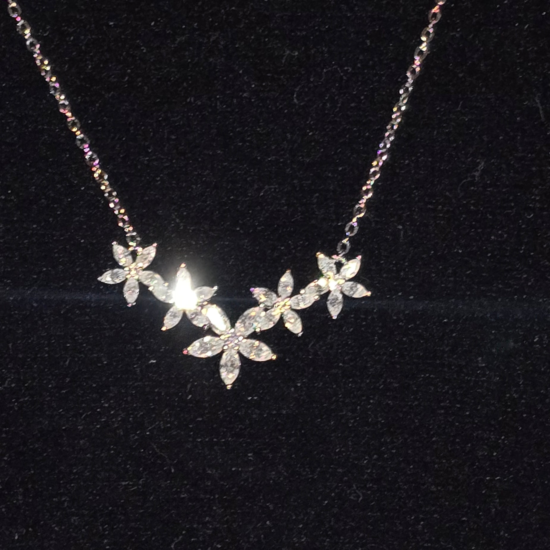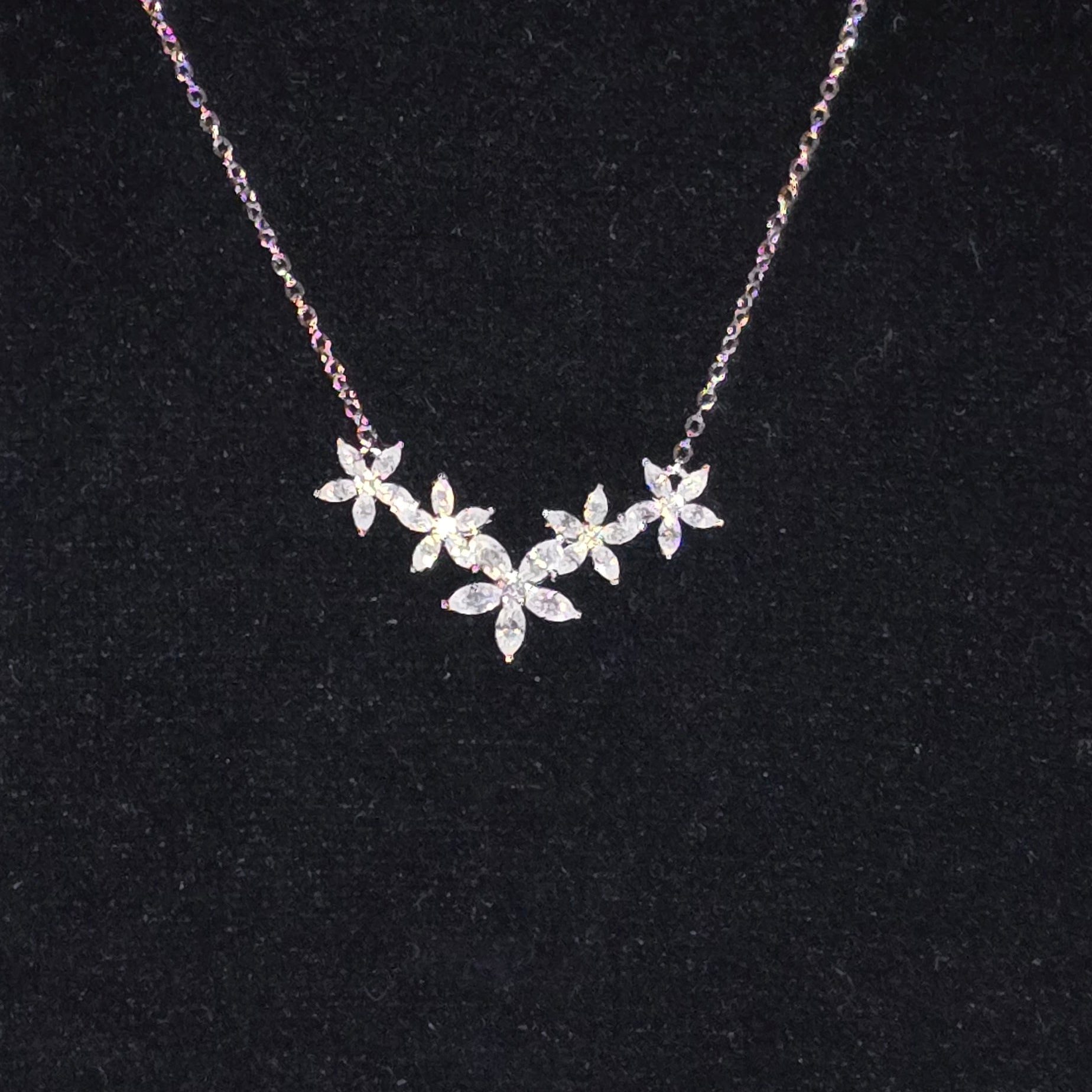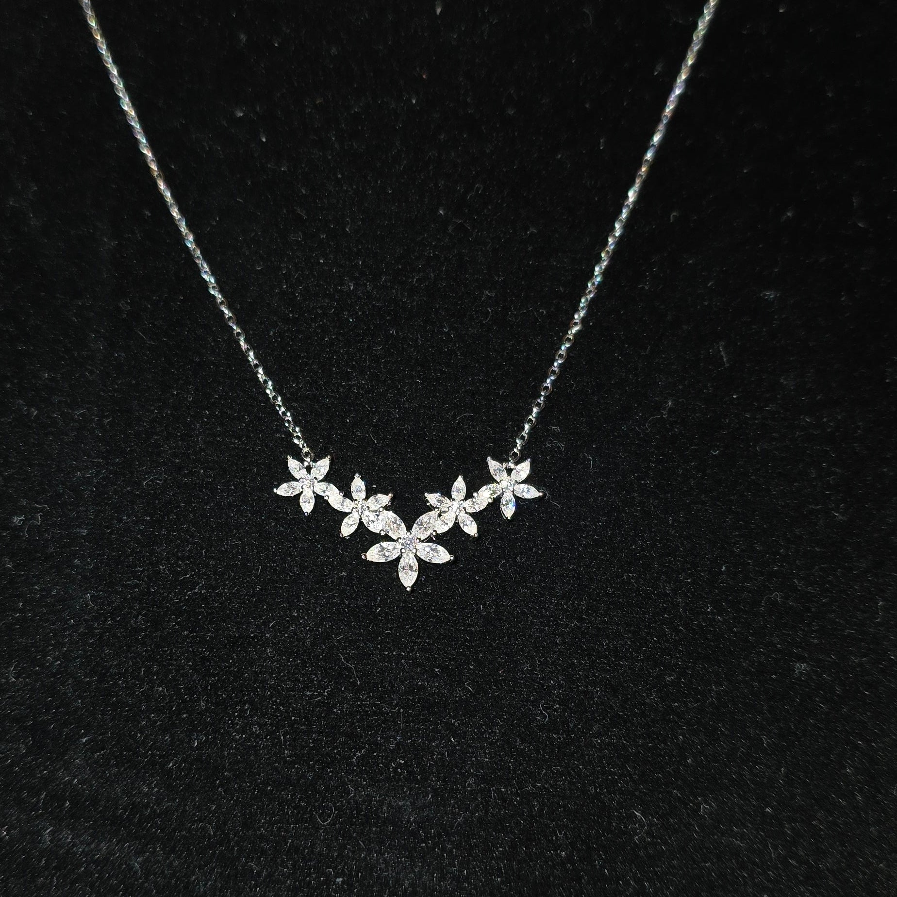 Elegant halsband i rhodiumpläterat silver med gnistrande marquisslipade diamanter formade som jasminblommor. Smycket utstrålar tidlös skönhet och lyx, perfekt för både vardag och fest. Levereras med äkthetscertifikat från GRA.